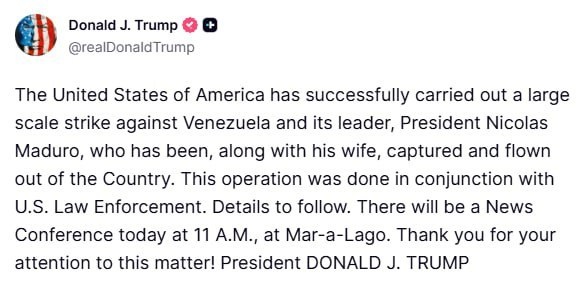 ⚡️AQSH Venesuela prezidenti Maduro hamda uning rafiqasini qo‘lga olib, ularni mamlakatdan olib chiqqan. Bu haqda Donald Tramp ma'lum qildi.