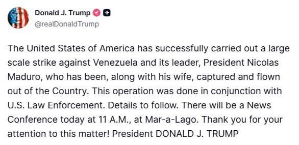 США успешно провели полномасштабный удар по Венесуэле, Николас Мадуро вместе с женой был захвачен в плен и вывезен из страны, заявил в своих соцсетях Дональд Трамп. Напомню, что Путин ничего не может сделать уже 4 года с бывшим комедиантом Зеленским.