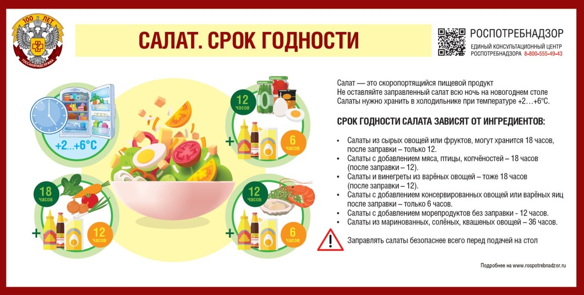 ? ❄️А вы знаете, сколько их можно хранить? ❗️Роспотребнадзор неоднократно напоминал, что любой салат – это благоприятная питательная среда для развития патогенных и условно-патогенных микроорганизмов, которые способны продуцировать токсины. 🤢Салат, который неправильно хранился, может стать причиной тяжёлого пищевого отравления. Салаты, особенно с майонезом, относят к скоропортящимся пищевым продуктам, которые рекомендуется хранить в холодильнике при температуре +2…+6ºС. 🫸 Сроки годности салатов регламентированы: 🥑🥦 Салаты из сырых овощей или фруктов, могут хранится 18 часов, после заправки – только 12. 🥩🍗 Салаты с добавлением мяса, птицы, копчёностей – 18 часов (после заправки – 12). 🥔 Салаты и винегреты из варёных овощей – 18 часов (после заправки – 12). 🥚 Салаты с добавлением консервированных овощей или варёных яиц после заправки – только 6 часов. 🍤 Салаты с добавлением морепродуктов без заправки – 12 часов. 🧆 Салаты из маринованных, солёных, квашеных овощей – 3