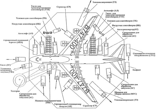 1. Встреча и выгрузка. К передней двери подъезжает трап или телетрап(рукав). Открывается багажный отсек. Начинается быстрая выгрузка багажа и груза на транспортеры. Параллельно заправщики и ассенизационная машина начинают готовиться к своей работе.