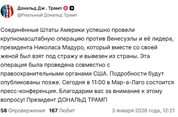 Николас Мадуро вместе с женой был захвачен и вывезен из страны, сообщает президент США Дональд Трамп. По словам американского лидера, эта операция была проведена совместно с правоохранительными органами США. Подробности будут сообщены позже. Сегодня в 11 утра в Мар-а-Лаго состоится пресс-конференция. Сайт "Другая Украина" / Telegram / Вконтакте / Центр поддержки Украинцев / Жалоба на ТЦК "Другая Украина" теперь в МАХ