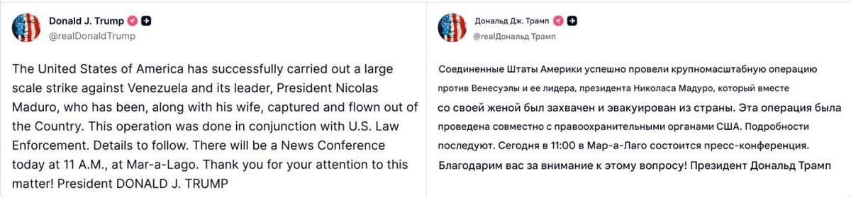 : • США успешно провели полномасштабный удар по Венесуэле. • Президент Венесуэлы Мадуро и его жена захвачены и вывезены из страны, эта операция была проведена совместно с американскими правоохранительными органами. • Сегодня состоится пресс-конференция.