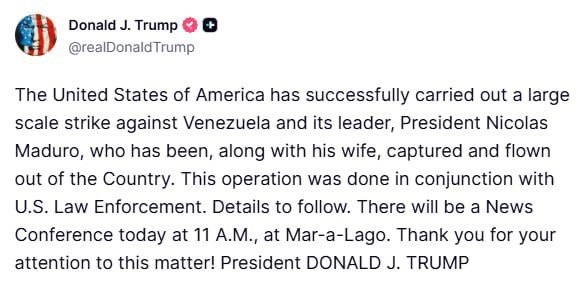 ❗️❗️❗️Президент США Дональд Трамп заявил, что президент Венесуэлы Николас Мадуро с женой были захвачены и вывезены из страны