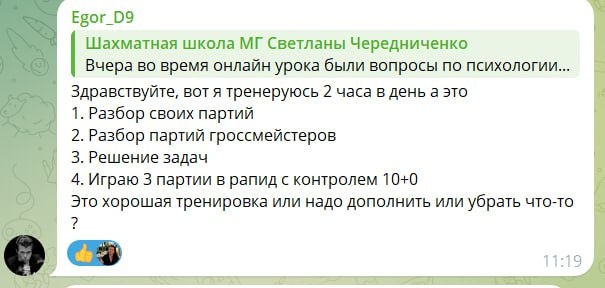 Поэтому рекомендации будут давать именно с точки зрения эффективности. 1. Разбор своих партий Смотрите, мы анализируем партии, чтобы найти наши ошибки в игре, а уже под эти ошибки подбирать материал для изучения. Самостоятельный анализ партий с компьютером не даст пользы, потому что вам будет сложно понять свои ошибки. Здесь рекомендую взять тренера, которые сделает вам анализ партий, найдет 3-5 основных ошибок в игре, а потом подберет книги или курсы для изучения. 2. Разбор партий гроссмейстеров Это всегда хорошо. Но если мы говорим за эффективность занятий, лучше смотреть партии гроссмейстеров под ваши слабые места в игре. 3. Решение задач Решать задачи - это всегда хорошо)) 4. Играю 3 партии в рапид с контролем 10+0 Вот этот пункт рекомендую изменить. Вам не нужно каждый день играть 3 партии. Сейчас у вас на это уходит около 1 часа времени или 50% того времени, что у вас есть на занятий. Рекомендую: - 5 дней в неделю изучайте темы под ваши ошибки в игре, решай