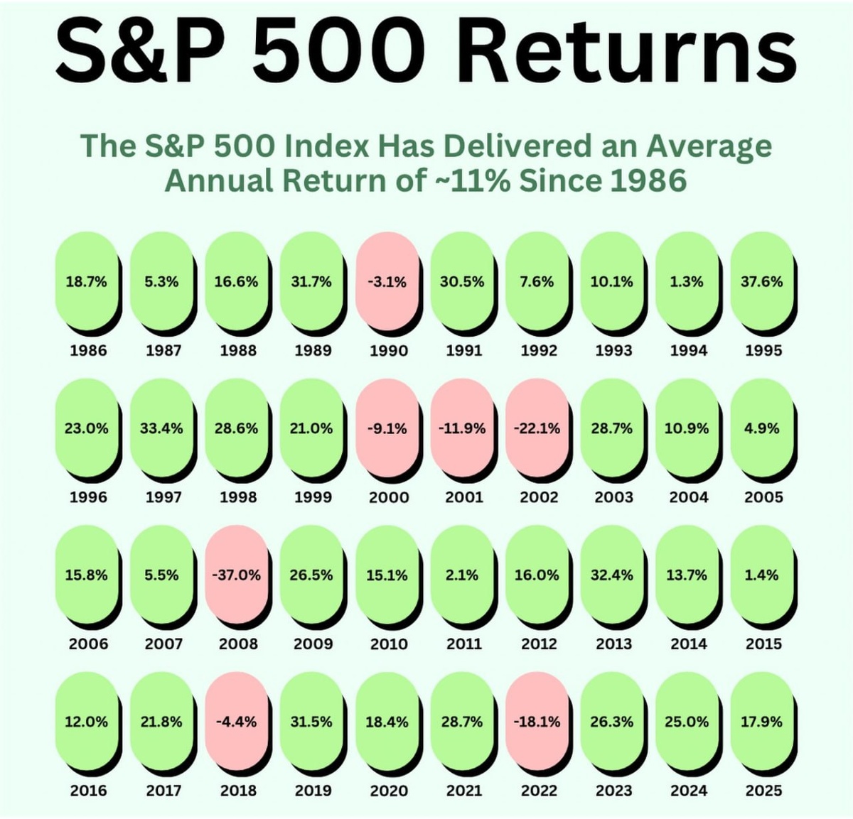 С 1986 года среднегодовая доходность в долларах ~11%, а в последние 10 лет примерно в 2 раза выше... Наш рынок, кстати, тоже до 2022 года примерно такими же темпами рос... #SP500