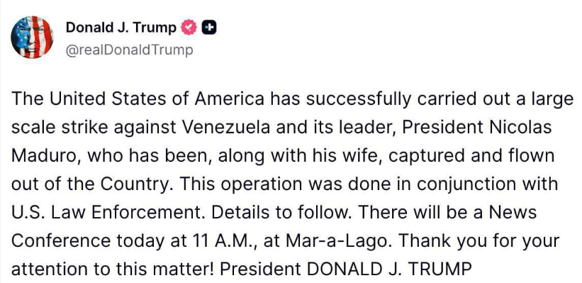 Президент Соединенных Штатов Америки Дональд Трамп заявил о захвате Николаса Мадуро и его жены. Лидер Венесуэлы был вывезен из страны американскими военными в ходе проведения специальной операции. Трамп опубликовал заявление в аккаунте в сети Truth Social. Он заявил дословно: «Соединённые Штаты Америки успешно провели крупномасштабный удар по Венесуэле и её лидеру — президенту Николасу Мадуро, который вместе со своей женой был захвачен и эвакуирован из страны. Эта операция была проведена совместно с правоохранительными органами США. Подробности последуют. Сегодня в 11:00 в Мар-а-Лаго состоится пресс-конференция». Подтверждения захвата Мадуро пока отсутствуют, однако в ходе сегодняшней операции США в Венесуэле американцы действительно высаживали вертолетные десанты в столице страны Каракасе. Предположительно были высажены бойцы подразделений специального назначения, нацеленные на его задержание.