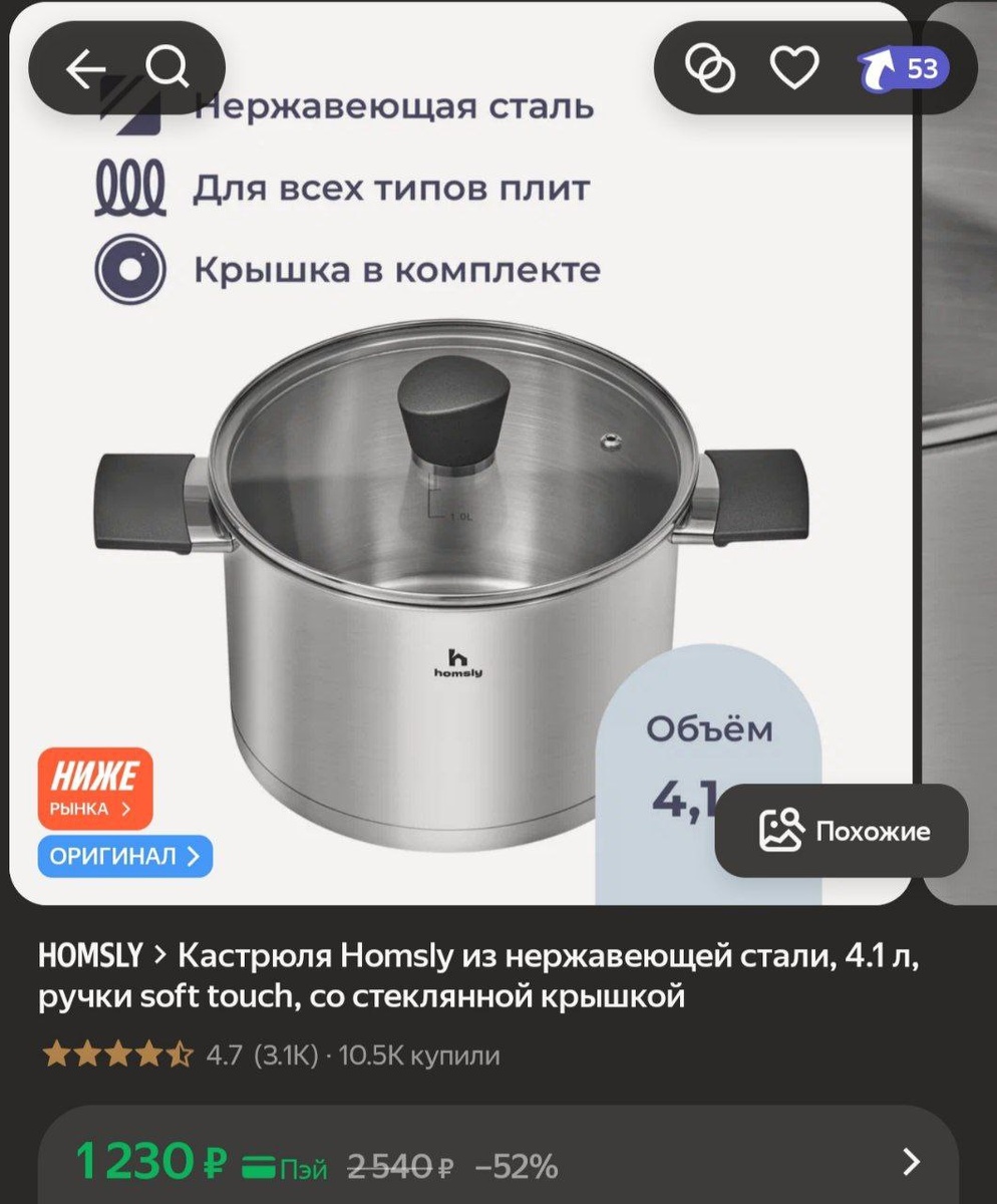 Кастрюля Homsly из нержавеющей стали, 4.1 л, ручки soft touch, со стеклянной крышкой за 1230₽🔥