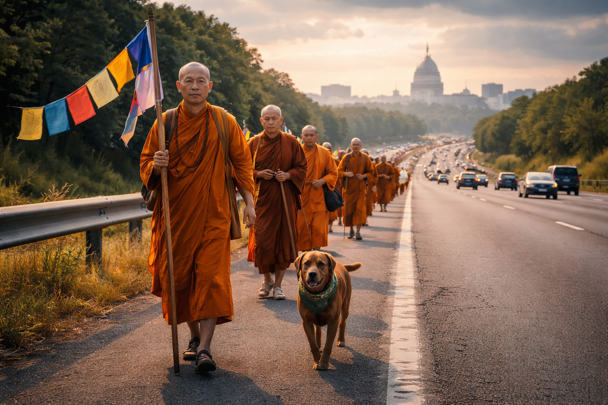 По сообщениям американских СМИ, в Соединённых Штатах продолжается уникальное религиозное и гуманитарное событие, которое уже несколько месяцев привлекает внимание верующих, журналистов и обычных прохожих. Группа буддийских монахов совершает многотысячный пеший переход через страну, неся простое, но в нынешнее время редкое послание — мир, сострадание и отказ от насилия. Марш начался осенью 2025 года на западном побережье США. С тех пор монахи прошли тысячи километров — через пустыни, сельские районы, шумные мегаполисы и малоизвестные городки. Их конечная цель — Вашингтон, где они планируют завершить путь символической молитвой за мир и межрелигиозное согласие. Монахи идут пешком, соблюдая строгие обеты: минимум личных вещей, простая еда, ночлег там, где их принимают местные жители или религиозные общины. Они не выкрикивают лозунгов, не несут политических плакатов — их «язык» это тишина, медленный шаг и открытость к диалогу. За последние дни стало известно, что двое участников марша полу