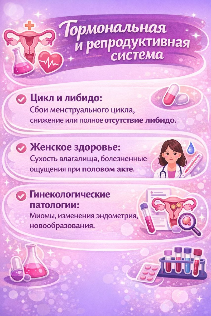 Цикл и либидо: Сбои менструального цикла, снижение или полное отсутствие либидо. Женское здоровье: Сухость влагалища, болезненные ощущения при половом акте. Гинекологические патологии: Миомы, изменения эндометрия, новообразования. Эмоции: Психоэмоциональная нестабильность, перепады настроения, депрессивные состояния, низкая стрессоустойчивость. Когнитивные навыки: Снижение обучаемости, ухудшение логики и мышления, «каша в голове», невнимательность, потеря интереса к новому. Продуктивность: Сложности с принятием решений, прокрастинация, проблемы со сном. Энергия: Быстрая утомляемость, ощущение бессилия, «хроническая усталость». Вес: Набор лишнего веса и рост жировой прослойки (даже при неизменном питании и нагрузках). Мышцы и кости: Потеря мышечной массы (саркопения), снижение мышечного тонуса, развитие остеопороза. Давление и пульс: Нарушения сердечного ритма, резкие «скачки» артериального давления. Терморегуляция: Приливы, внезапные ощущения «жара». Ткани: Резкое ухудшение каче