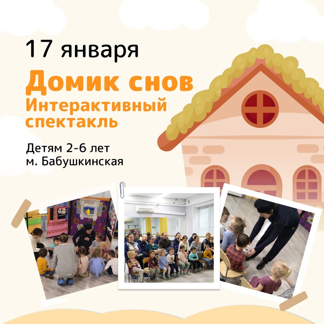 ! «Домик снов» от театра «4 угла». Вы когда-нибудь задумывались откуда берутся сны? Нет... А мы знаем! Их варит волшебник Сплюш, кладет детям под подушку, когда они засыпают. Правда в этом деле ему мешает вредный Несплюш... Если вам интересно узнать из чего состоят сны, усмирить Несплюша, то ждем вас на представлении. ✅ 17.01 (сб.) в 11.00 ✅ Для детей 2-4 лет ✅ Стоимость билета для ребенка 1500 руб. до 14 января, 15-17 января - 2000 руб. Один сопровождающий взрослый бесплатно. ✅ м. Бабушкинская, ул. Искры, 9 корп. 2, Семейный центр «Ученый кот» 👉👉👉 Записаться Места ограничены. Записывайтесь и зовите друзей. 🎁 Посетите 5 спектаклей для малышей и получите 6-й спектакль бесплатно! Возьмите дневничок посещений у наших администраторов. Анонсы спектаклей публикуем в чате телеграм Остались вопросы? Свяжитесь с нами Тел. +7 (495) 968-86-47 ✍️Написать администратору в телеграм