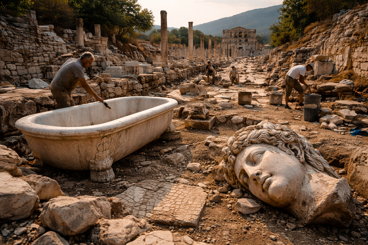 В одном из самых известных античных городов Средиземноморья — Эфес — археологи сделали открытие, которое уже называют одним из самых интригующих за последнее время. Во время плановых раскопок в историческом центре города в Турции были обнаружены необычные предметы римской эпохи, датируемые периодом с I века до н. э. по I век н. э. Главная особенность находки заключается не только в самих артефактах, но и в месте их обнаружения. Мраморная ванна и фрагмент статуи были найдены прямо в дорожном полотне древнего квартала, а не в термах, виллах или общественных зданиях, где подобные предметы обычно и ищут археологи. По словам исследователей, это нарушает привычную логику городской планировки античного Эфеса и заставляет по-новому взглянуть на организацию городского пространства. «Такие предметы не выбрасывали случайно. Их присутствие в дороге говорит либо о спешной реконструкции, либо о кризисном периоде в жизни города», — отмечают участники раскопок. Учёные предполагают, что артефакты могли