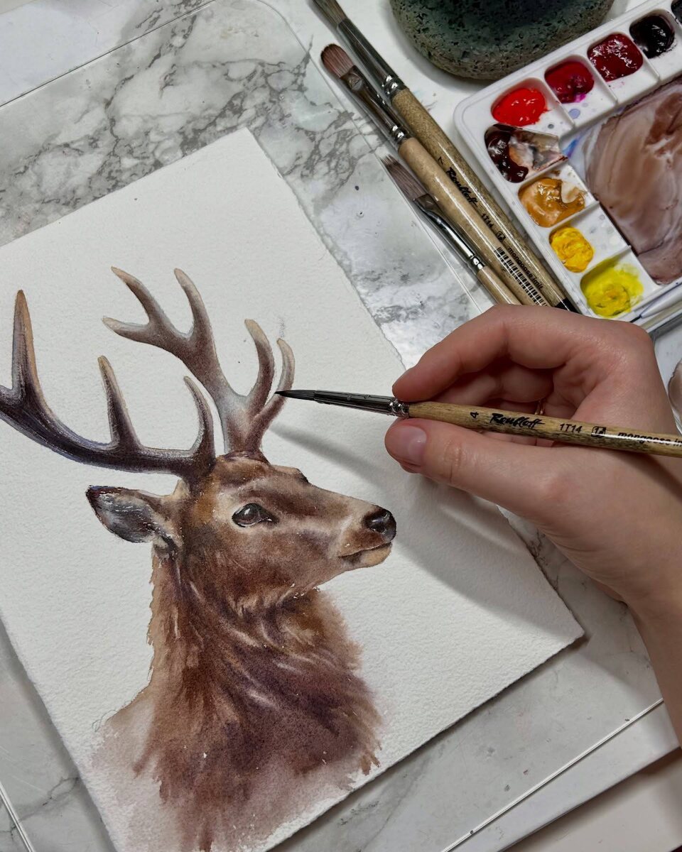 Новогодний акварельный олень, созданный художницей Ириной Шагиной 🎄❄️
