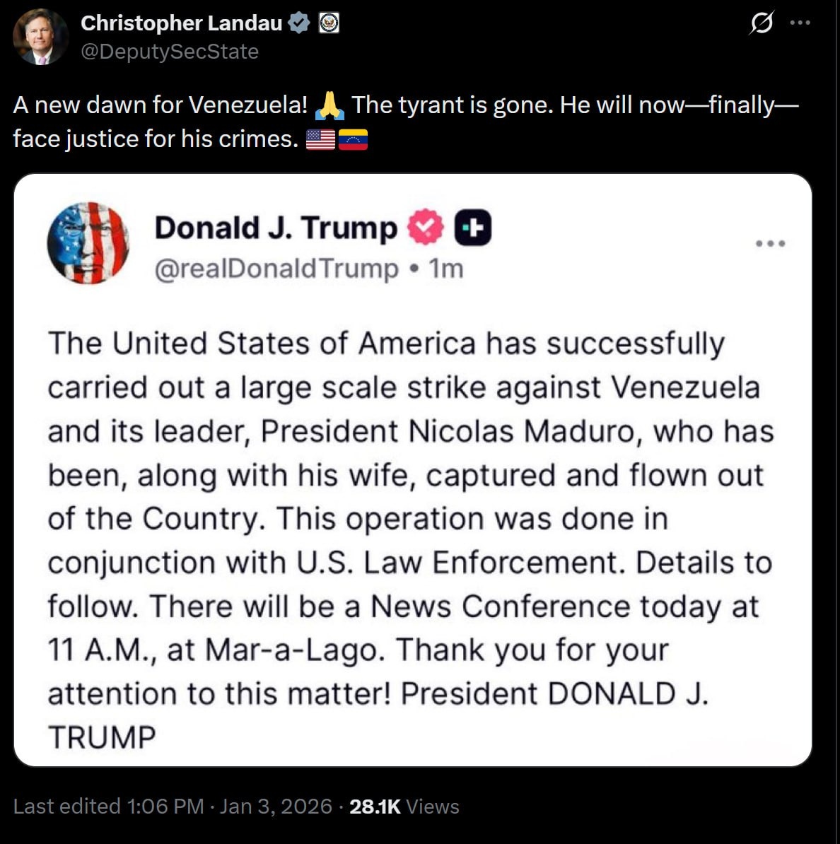 ». Соответствующее заявление американский чиновник сделал на фоне сообщений о завершении военной операции США в стране. В заявлении подчёркивается, что, по мнению Вашингтона, в Венесуэле наступает «новый рассвет», а существовавший режим назван тираническим. Чиновник утверждает, что Мадуро привлекут к ответственности в судебном порядке. 🟪Читай в Max | 🚀Читай в Telegram | 🥰Смотри на RUTUBE