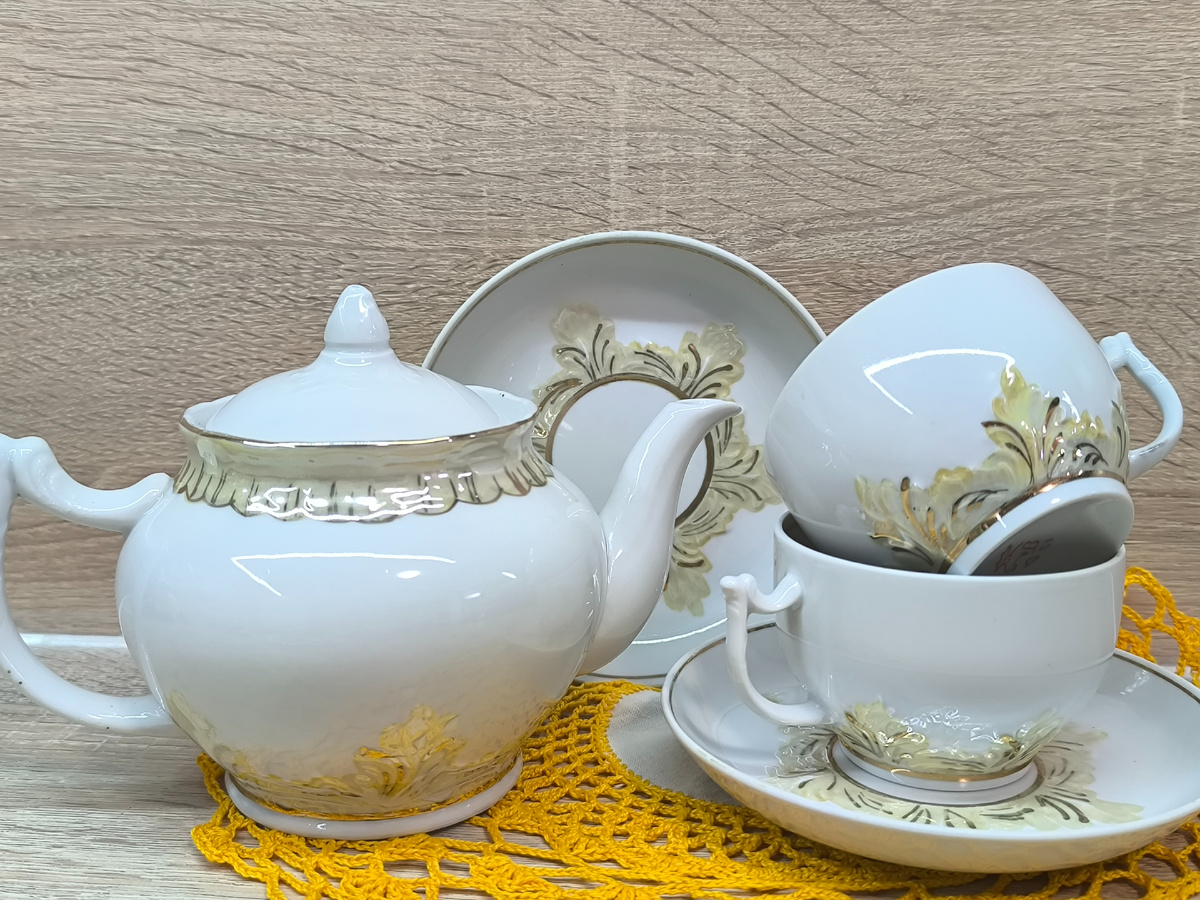 Чайный набор оказался из сервиза "золотистый барбарис", форма рельефная, производство Дмитровского фарфорового завода, клеймо с "головой лося". Очень приятная расцветка набора.