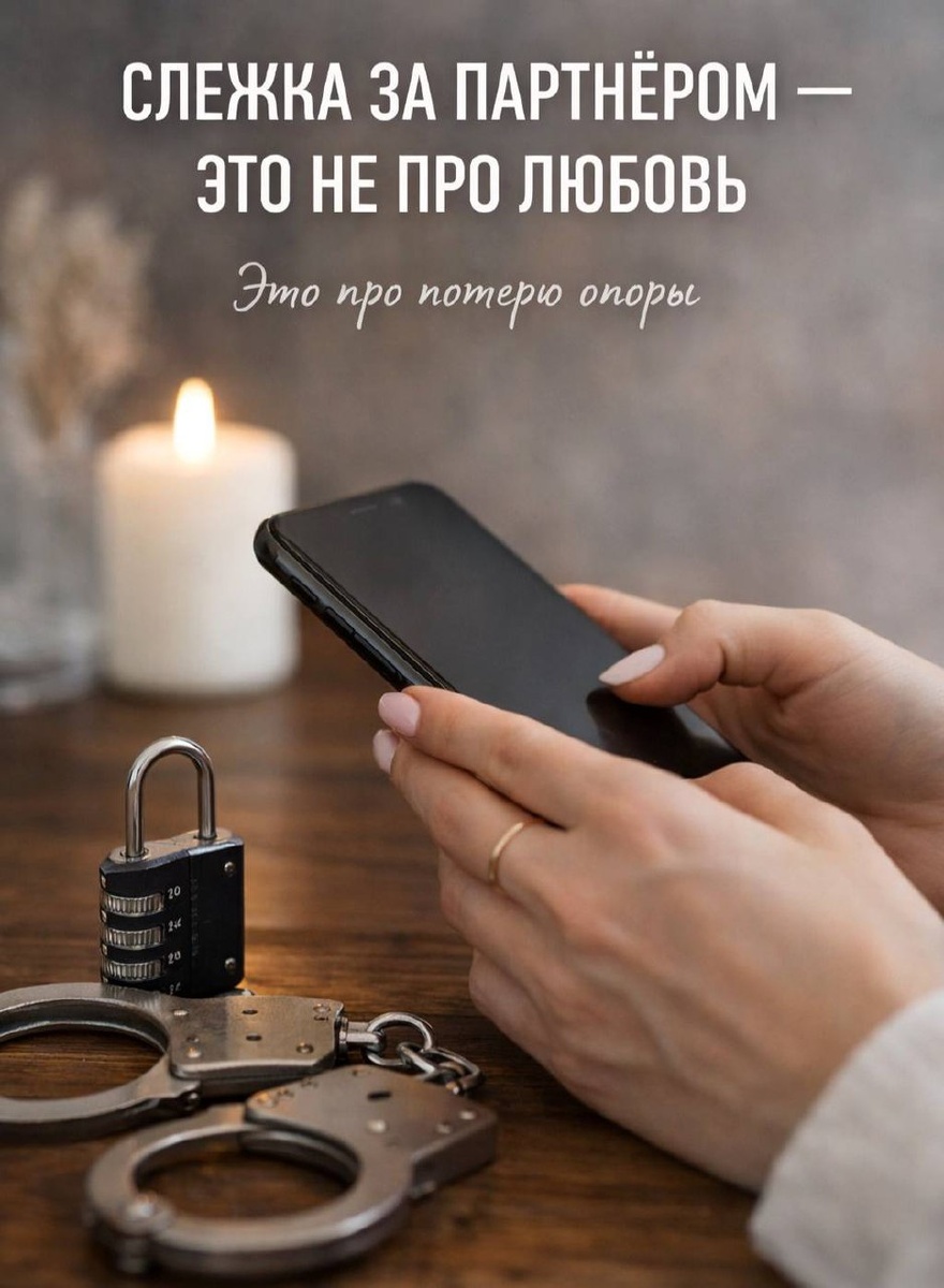 ЭТО ПРО ПОТЕРЮ СВОЕЙ ОПОРЫ Скажу это прямо. Слежка - это попытка вернуть безопасность, потеряв себя. Когда человек следит за партнёром, он на самом деле следит не за другим - он пытается удержать себя от распада. Это не ревность, как чувство, это дыра в собственной опоре и симптом хронической тревоги. Внутри всегда один и тот же процесс: психика не выносит неопределённости. «Я не знаю, где он и что думает/чувствует» переживается как угроза. И тогда включается контроль - самый доступный способ создать иллюзию стабильности и спокойствия. Контроль не про доверие. Он про попытку заменить внутреннюю опору внешними доказательствами. Каждая проверка телефона - это не поиск правды, это попытка снизить напряжение здесь и сейчас. Да, на минуту становится легче. Но цена у этого облегчения высокая. Мозг обучается тревоге. Он запоминает: «Чтобы не разрушиться - нужно проверять». И постепенно вся психическая энергия уходит не на жизнь, не на развитие, не на близость, а на слежку, анализ, интерп