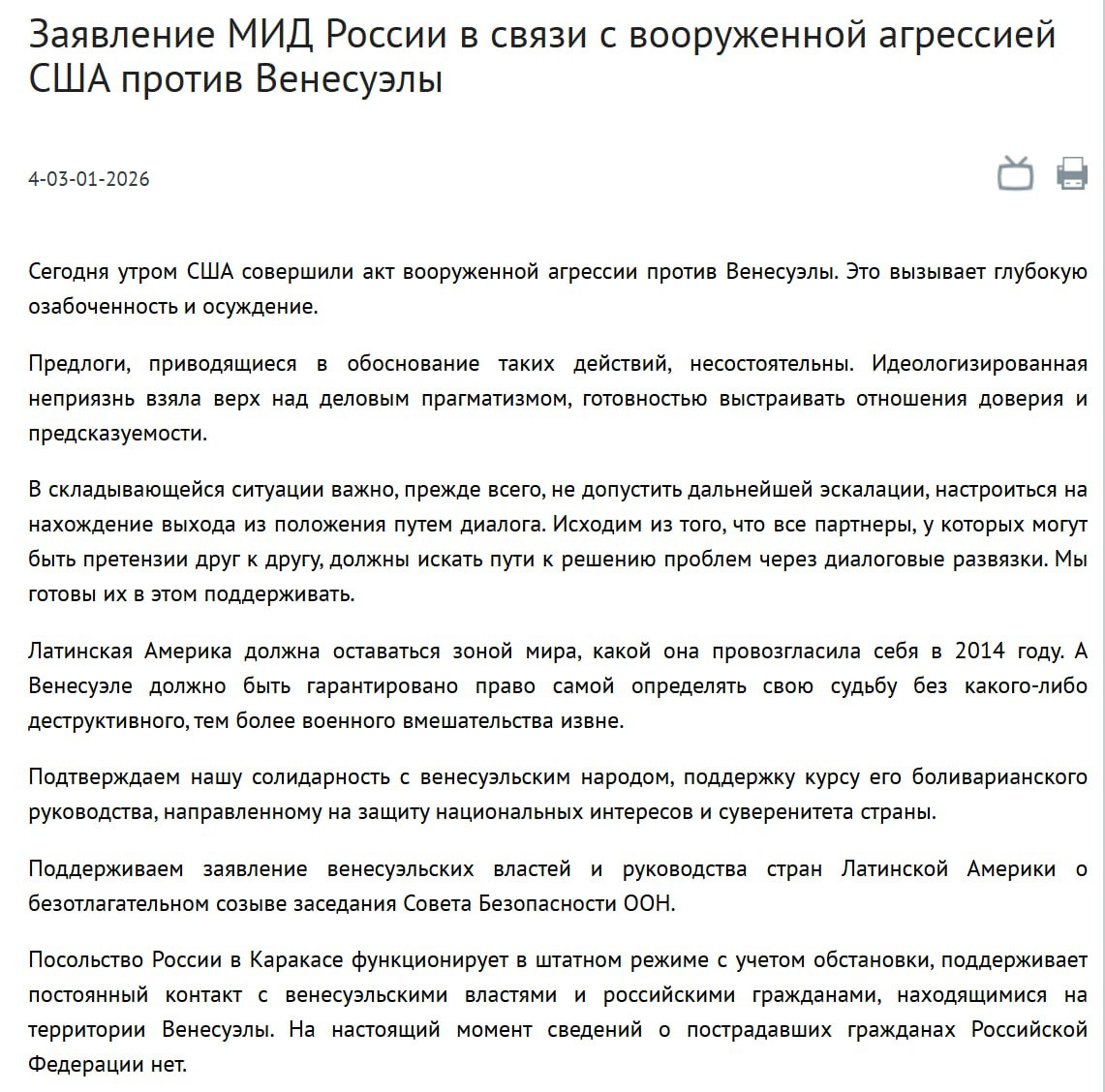 ⚡️ МИД РФ осудил вооруженную агрессию США против Венесуэлы и выразил глубокую озабоченность.