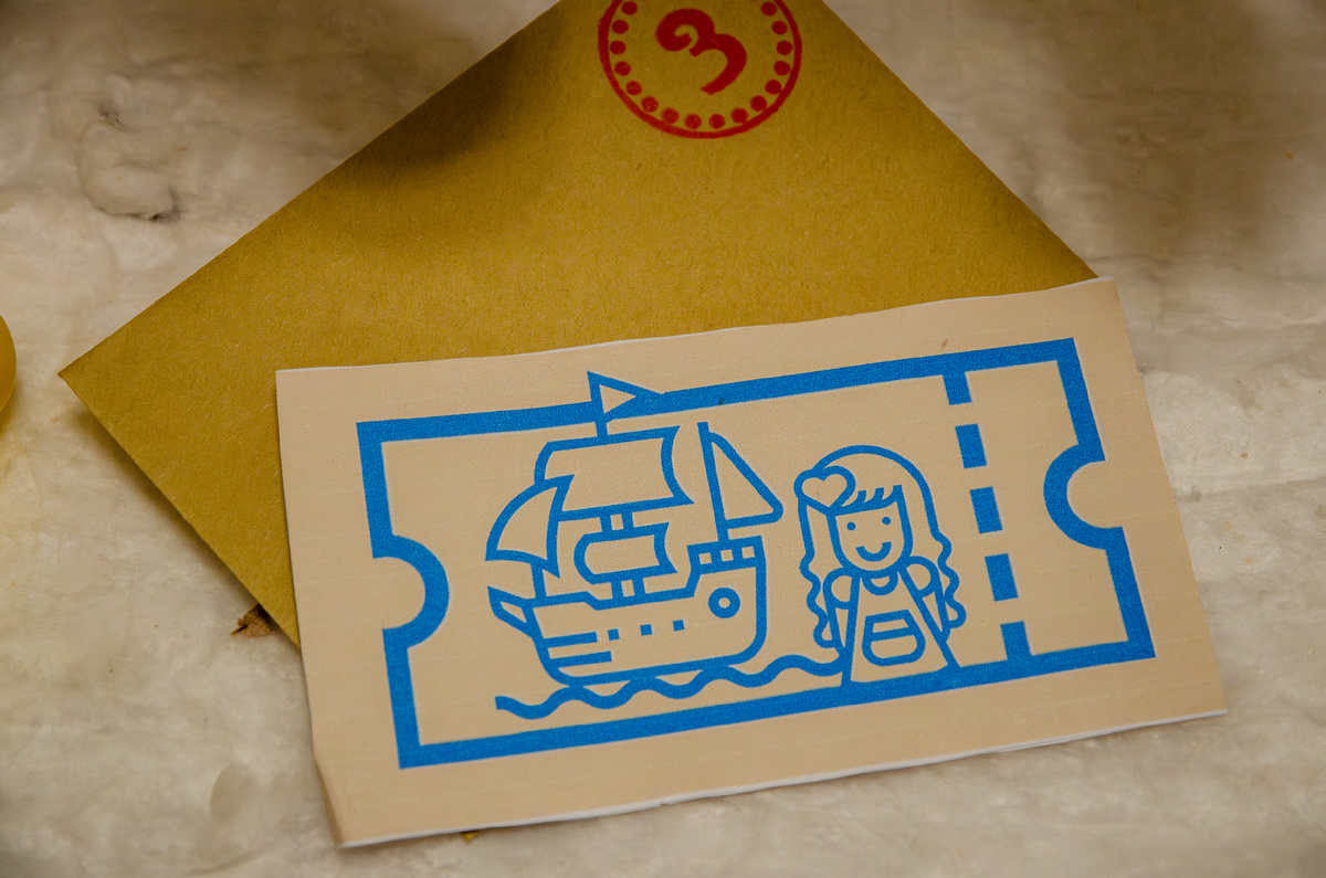 Управлять кораблём изначально предполагалось с помощью магнита, спрятанного под "океаном" (похожее задание нам как раз недавно повстречалось на новогоднем мероприятии), но через картон мощности магнита не хватало. Поэтому задача была максимально упрощена, на нос ледокола привязана веревочка, за которую нужно было просто тянуть, лавируя среди льдин. Письмо с дальнейшими инструкциями и карту мы нашли, причалив к берегу.