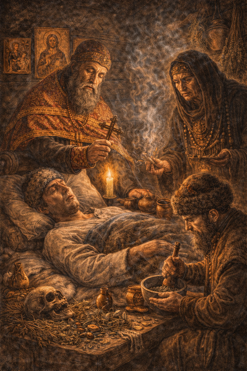 На протяжении столетий эта система взглядов эволюционировала медленно и противоречиво. Если в XI–XIV веках сакральные и магические представления доминировали практически безраздельно, то с XV века начинают пробиваться ростки рационального подхода. Особенно заметно это стало в осмыслении эпидемий, где наряду с молитвами начали применяться карантинные меры, а также при царском дворе, где, несмотря на все риски, постепенно утверждалась практика приглашения иностранных врачей. К концу XVII века, с основанием Аптекарского приказа, медицина начала свой долгий путь институционализации.