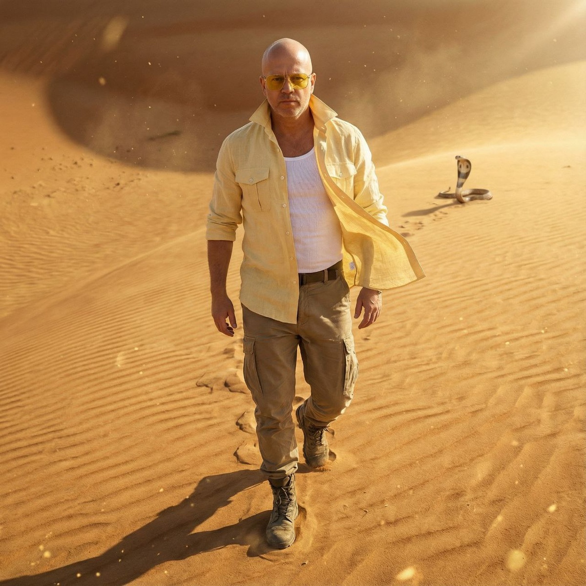 Используй и неизменяй лицо, в точности как на эталонном фото. портрет мужчины в теплых тонах, стоящего в пустыне, в желтых солнцезащитных очках и светло-желтой рубашке-сафари с расстегнутым воротником. Солнце ярко светит сбоку, создавая драматические тени. Передний план: Цветной кадр в полный рост, идущего по песчаным дюнам, в развевающейся расстегнутой льняной рубашке, белой майке под ней, брюках-карго и прочных ботинках. Широкий и слегка низкий ракурс камеры, запечатлевающий длинные тени на песке. позади мужчины вдали виднеется змея кобра. Яркие золотистые тона, кинематографические частицы пыли, настроение в стиле приключенческой моды. ультрареализм, максимальная кинемотографическая детализация ➡️ Тут БОТЫ 💵 Отблагодарить