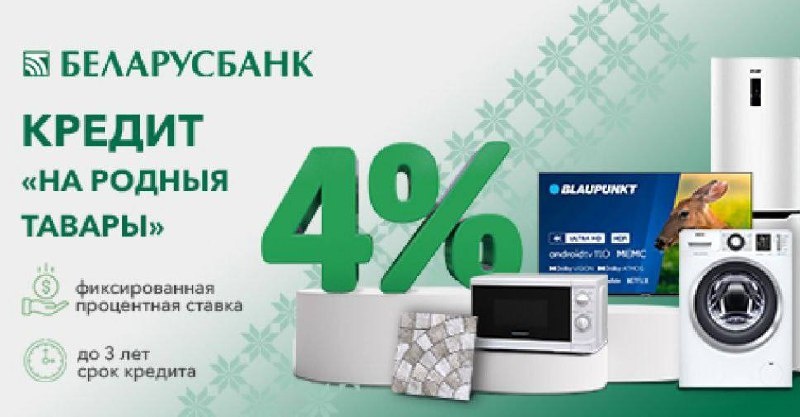 ! Что нового? ✅ Расширен список товаров. Теперь в перечень входят не только уже привычные вещи, но и современные гаджеты вроде ноутбуков, мини-ПК, моноблоков и даже серверов! 💻 А ещё — обои, зеркала, цемент, и, конечно же, стильная одежда от известных белорусских брендов (пальто, костюмы, сумки из натуральной кожи 👜), а также полезная техника для дома: соковыжималки, электроплитки, самокаты и электросамокаты 🛴. ✅ Больше производителей. К программе присоединились новые белорусские компании, производящие отопительные приборы, мотовелотовары, деревянные окна и двери, постельное белье, мебель, металлические двери, микроволновки, одежду из натурального меха и многое другое! 🚪 ✅ Льготные условия. Как и раньше, кредиты выдает "Беларусбанк" под очень приятные 4% годовых! 💰 Это отличная возможность сделать выгодную покупку без лишних переплат.