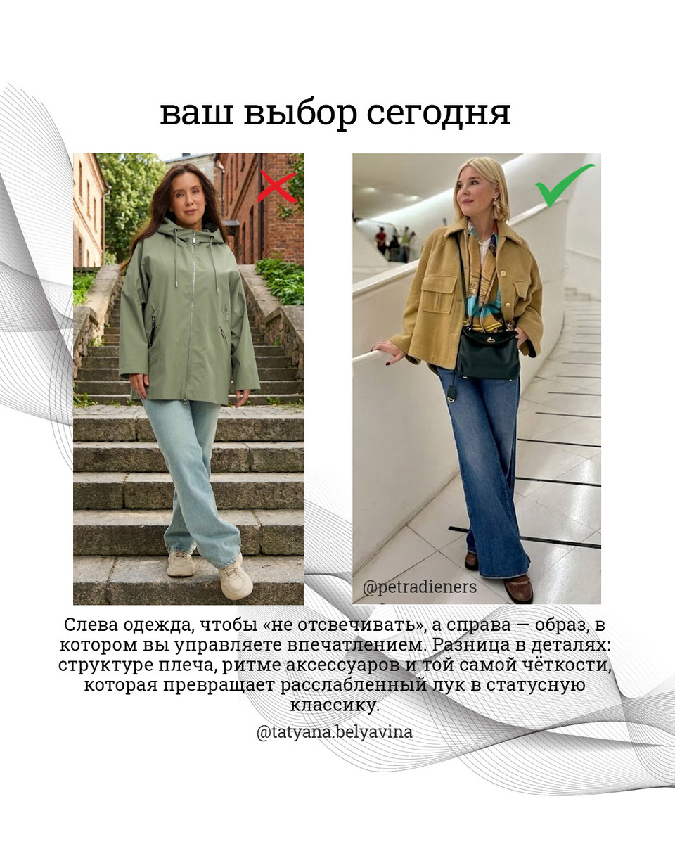 Гардеробный депресняк: почему «нормальные» вещи делают из нас невидимок? 😱 Утро. Шкаф забит вещами, которые вы покупали в здравом уме и трезвой памяти. Но вещи складываются в образы, которые вам совершенно не нравятся Мы все качаемся на этих качелях: На одном конце 👉 ловушка «удобной женщины» Это когда страх выглядеть неуместно побеждает, и вы покупаете что-то «базовое и качественное»🙄 Это тот «эффект тетки» новой волны: когда всё как надо, но вы в этом выглядите на 10 лет старше и на 20% грустнее На другом конце 👉 «погоня за актуальностью» Вы покупаете все самое актуальное.Но вместо «стильной штучки» из зеркала смотрит странная женщина Подвох в том, что после 40 внешность перестает прощать «приблизительность». В 20 лет лицо —это чистый софт, на него можно «натянуть» любой тренд. В 40+ ваше лицо —это уже архитектура. Это жесткий каркас, определенный ритм линий и характер💁 Вы не «некрасивая» и не «возрастная». Вы просто нарушаете законы физики собственного лица Я не предлагаю вам в