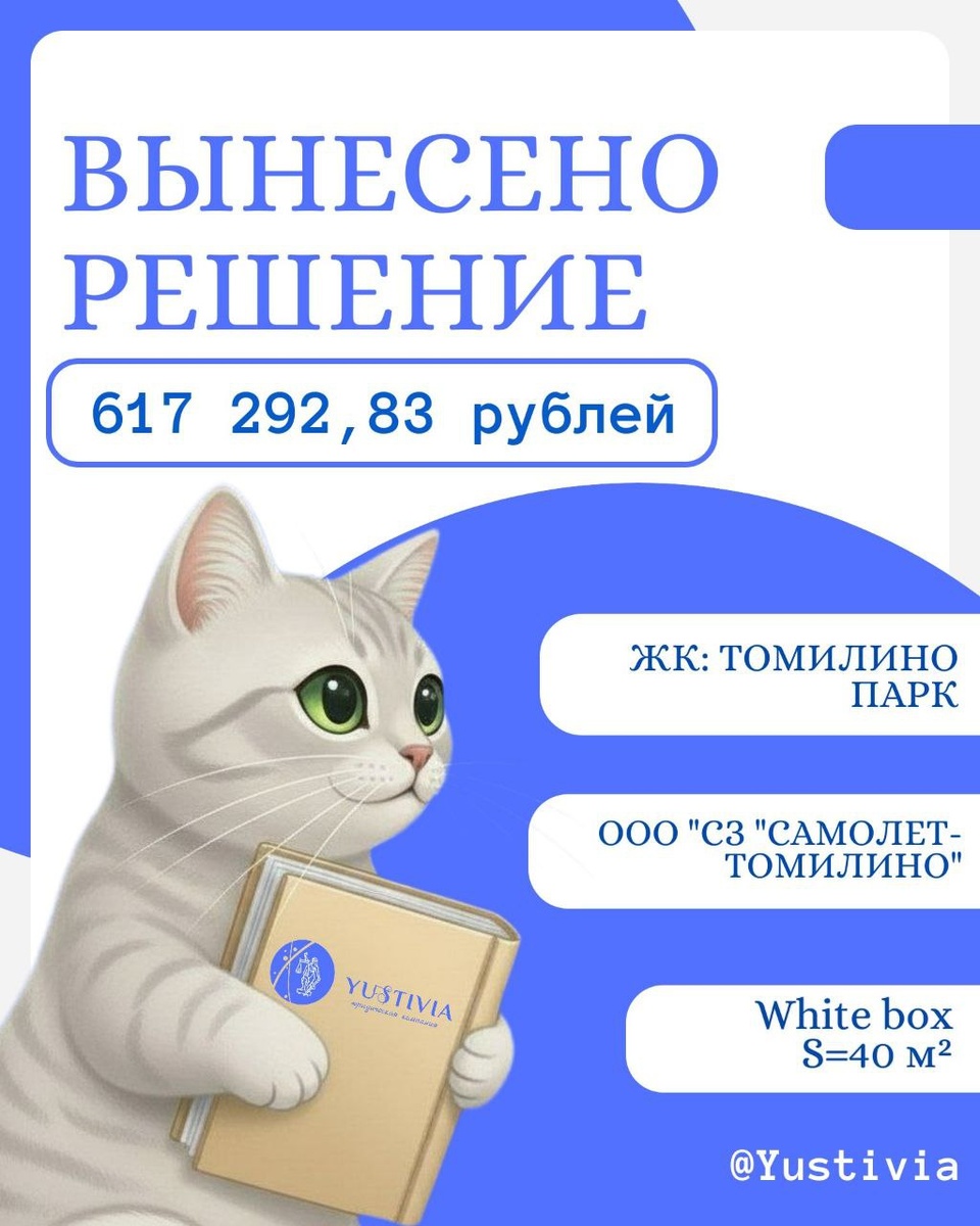 📘Взыскание компенсации за строительные недостатки квартиры по договору купли-продажи ➿➿➿➿➿➿➿➿➿ Застройщик: ООО "СЗ "САМОЛЕТ-ТОМИЛИНО" ЖК: ТОМИЛИНО ПАРК Площадь - 40 м² White box Суд: Люберецкий городской суд Московской области Судья: Иванина Е.Л. Дело: № 2-12796/2025 ➿➿➿➿➿➿➿➿➿ Взысканные суммы: ➡️Недостатки: 387 520; ➡️Неустойка: 15 500,80. ➡️Штраф: 100 000; ➡️Моральный вред: 30 000; ➡️Суд. расходы: 84 272,03. ➿➿➿➿➿➿➿➿➿ 💸Итого в пользу клиента: 617 292,83 рублей. 🆗Приёмка квартиры и строительно-техническая экспертиза – за наш счет! Лучше звоните Юсти❤️ ➿➿➿➿➿➿➿➿➿ 📞+7 (936) 333-33-48 ✅@Yustivia 🌐yustivia.ru