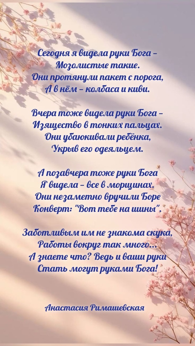 Сегодня я видела руки Бога — Мозолистые такие. Они протянули пакет с порога, А в нём — колбаса и киви. Вчера тоже видела руки Бога — Изящество в тонких пальцах. Они убаюкивали ребёнка, Укрыв его одеяльцем. А позавчера тоже руки Бога Я видела — все в морщинах. Они незаметно вручили Боре Конверт: "Вот тебе на шины". Заботливым им не знакома скука, Работы вокруг так много... А знаете что? Ведь и ваши руки Стать могут руками Бога! Источник: https://stihi.ru/avtor/nastunyarb также на: https://vk.com/slovonadezhdy_IB https://t.me/Slovonadezhdy_IB #стихи #христианскиестихи #Богвнас #Богчерезнас #добро #Словонадежды #christianverses #christianpoems #Slovonadezhdy #wordofhope #Стихиовере #Стихидляверующих #Стихиолюбви #СтихиоБоге #Римашевская