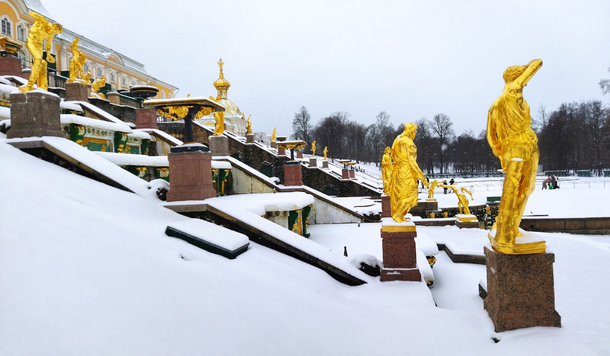 Наша северо-западная местность не видит солнца уже второй месяц, поэтому окружающий мир погрузился в сотни оттенков серого, что оказывает депрессивное влияние на тонкую душевную организацию многих граждан. Хочется выпить. Чая там, какого-нибудь, или коньяку… исключительно, чтобы её, эту тонкую организацию, поддержать! Или уехать куда-нибудь из этой кромешной серости в … другую серость. Хотя бы. Вчера мы с друзьями поехали в Петергоф. Зимний Петергоф имеет существенные преимущества перед летним своим состоянием. Во-первых, почти нет никакого. Было малолюдно, холодно и тихо. Во-вторых, можно припарковаться в приятной близости от входа, и не раздражаться на толпы бредущих по дорожкам парка любителей прекрасного. Нижний сад, в отсутствии людей, фонтанов и скульптур выглядит сонным провинциальном парком культуры и отдыха. Нет помпезности, величия. Хотя Большой Дворец нисколько не уменьшился в размерах, только немного потускнел. То тут, то там сиротливо стоят серые короба, скрывающие в своих