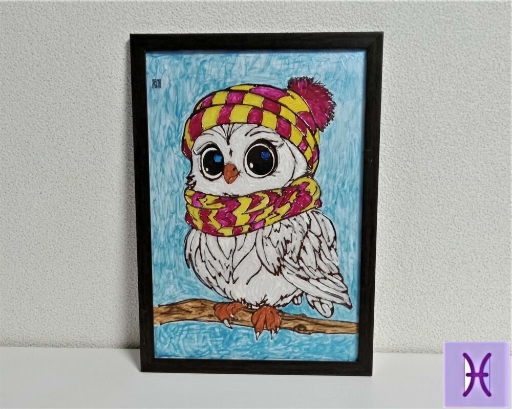 Много сов родилось с помощью моих рук. И все они разлетелись по всей России. И вот совсем недавно появилась у меня в доме ещё одна сова. Нет скорей это мальчик, совун. Я назвала его Жорик. Мой Жорик родился на занятиях в отделении дневного пребывания при центре соцзащиты для пенсионеров. Чем занять досуговое время пенсионеров? Конечно же каким-либо рукодельным творчеством. У нашей замечательной руководительницы Вероники много разных идей. И я выбрала для себя изготовление панно в технике витражной росписи. Я не художник, и, собственно поэтому, я называю мой шедевр не картиной, а панно. Я выбрала для себя рисунок совы из интернета. Вот такой. Правда, милашка, Жорик? Работа выполнялась на стекле. Была куплена стандартная рамка со стеклом для фото стандартного размера А4. Размер работы в рамке 32 см х 23 см. Последовательность работы над панно: 1. Поскольку в помещении занимались женщины пенсионного возраста +++, каждая со своими закидонами, то стекло никакими пахучими жидкостями, типа а