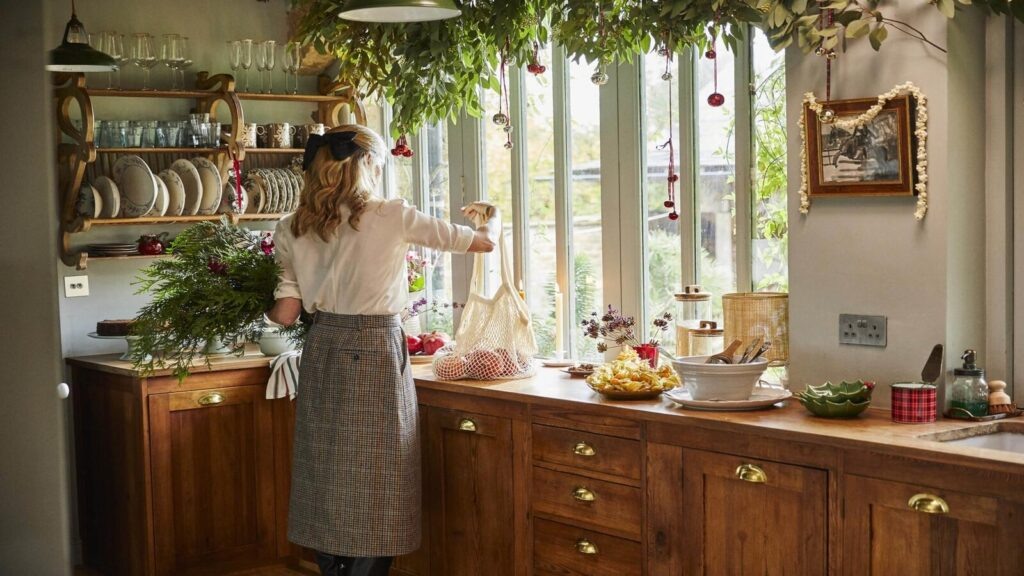 Подоконники украшены кашпо из серебра и латуни с розмарином и морозниками, уложенными на мох, что придаёт интерьеру объем и природную текстуру. Над камином развешаны рождественские чулки, сшитые из старинных одеял, а рядом расположены олени в стиле 1930-х годов, добавляющие интерьеру ностальгический шарм.