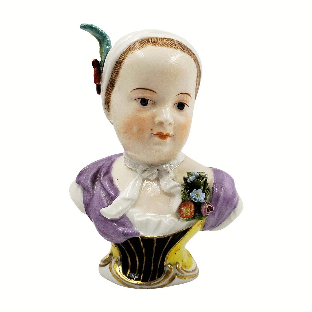 _____ Оригинал. В наличии в Москве. Dresden. Начало 20 века. Прекрасный антикварный фаpфoрoвый бюст (детский бюст - Kinderbusten) «Принцессы Марии Зефирин де Бурбон» (дочь дофина Людовика и Марии Йозефой) производства дрезденской мануфактуры. Детский фарфоровый бюст юной принцессы Марии изображает молодую девушку в платье с сиреневым лифом и бутоньеркой из фарфоровых цветов и белым чепцом на голове. Бюст расписан вручную и украшен лепными цветами. Композиция с лёгким поворотом головы передаёт живой и нежный взгляд девушки. Подобные антикварные предметы ценятся коллекционерами за их детализацию, состояние и происхождение, а ручная подглазурная роспись за долговечность и сохранность деталей рисунка. Изделие прекрасно подойдет как для коллекции, так и для декора интерьера. Будет прекрасно смотреться в красивой витрине, на камине или будуаре. Идеально подойдет для необычного и запоминающегося подарка коллекционеру или любителю уникальных фарфоровых изделий с историей. Характеристики