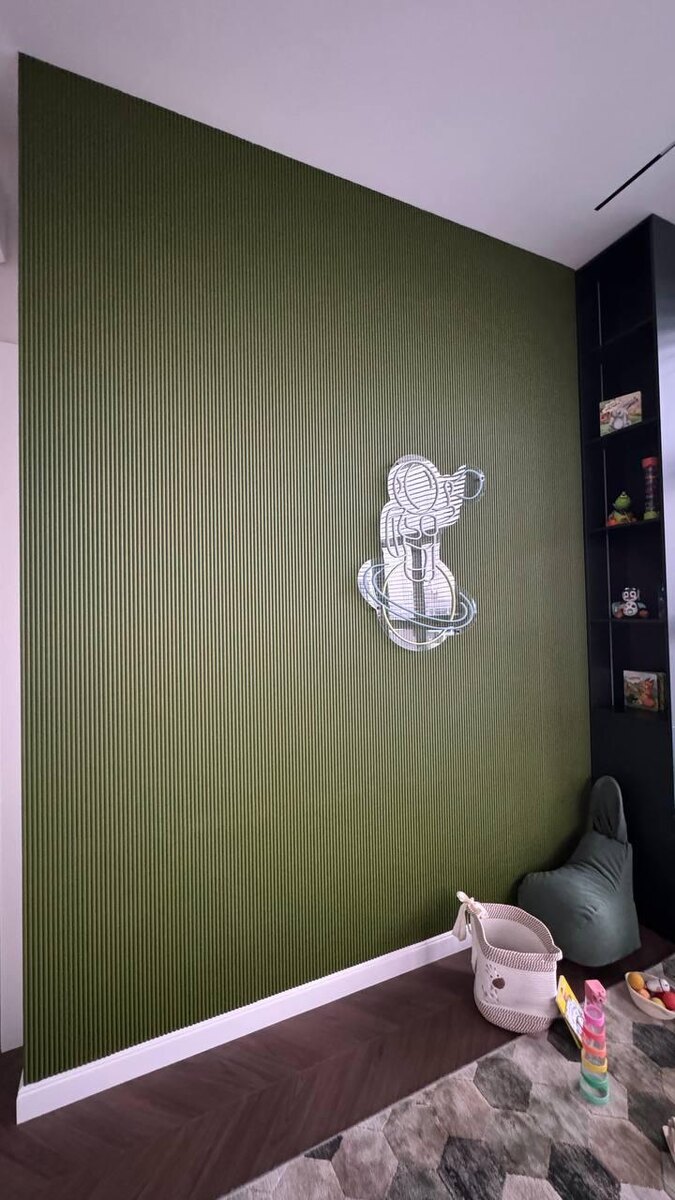 🎉🎁🌲 А мы показываем вам комнату из нашего недавно законченного проекта Это детская, и здесь нам было важно сделать пространство не «на вырост», а про интерес, фантазию и спокойствие. Основной акцент - глубокий зелёный цвет. Он не перегружает, не раздражает, а наоборот - успокаивает и хорошо работает как фон для игр и отдыха. Неоновый светильник - это не просто декор. Он добавляет ощущение игры, немного космоса, немного сказки. Вечером это мягкий сценарный свет, который создаёт атмосферу, а не «яркий потолочный». Как вам детская?)