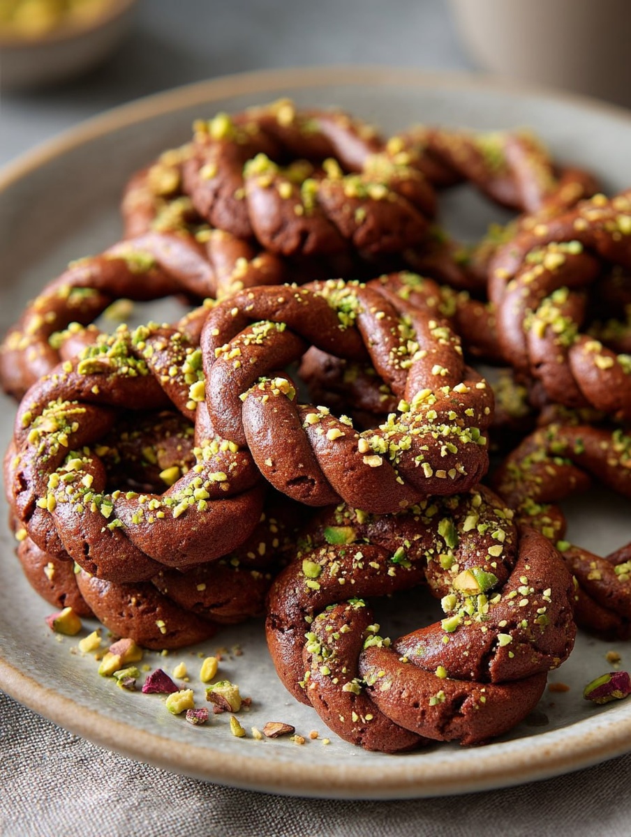 ) Печенье «Рождественские венки» 🕒 Время приготовления: 40 мин 🍽 Порций: 30 🔥 Калорийность: 100 кКал на порцию Эффектное печенье из песочного шоколадного теста. Судя по названию, относится к традиционной рождественской выпечке. 🧂 Вам понадобится: Шоколад — 100 г Мука пшеничная — 250 г Яичный желток — 2 шт. Сахарная пудра — 100 г Сливочное масло — 100 г Фисташки — 50 г 👩🍳 Приготовление 1️⃣ этап Ингредиенты 1-го этапа: Шоколад — 100 г В мельнице перемалываем шоколадку в мелкую крошку. Шоколад должен быть тёмным или горьким. 2️⃣ этап Ингредиенты 2-го этапа: Мука пшеничная — 250 г Яичный желток — 2 шт. Сахарная пудра — 100 г На рабочую поверхность высыпаем муку, шоколад, сахарную пудру. В центр выливаем желтки. Вместо них можно взять одно целое яйцо, но желтки делают песочное тесто более рассыпчатым. Разрыхлитель в тесто не добавляется, т.к. оно должно сохранять форму во время выпечки. 3️⃣ этап Ингредиенты 3-го этапа: Сливочное масло — 100 г Добавляем мягкое масло и быстр