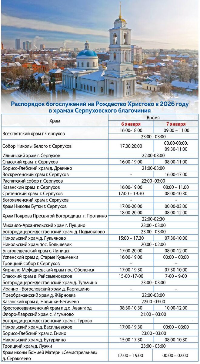 ✨ Рождество Христово 🌟В храмах Городского округа Серпухов основные ночные богослужения начнутся с 20:00–23:00 и продлятся до 02:00–03:00. 👉Полное расписание служб по всем храмам благочиния смотрите в графике. 📆 06.01.2026 ⭐Поддержать канал голосом 💰 Канал Вакансии Серпухова ✅ Мероприятия Серпухов https://dzen.ru/id/66f01c6eb4c6fe60c9ca1608 http://vk.com/serpukhov_events http://dzen.ru/serpukhov_events