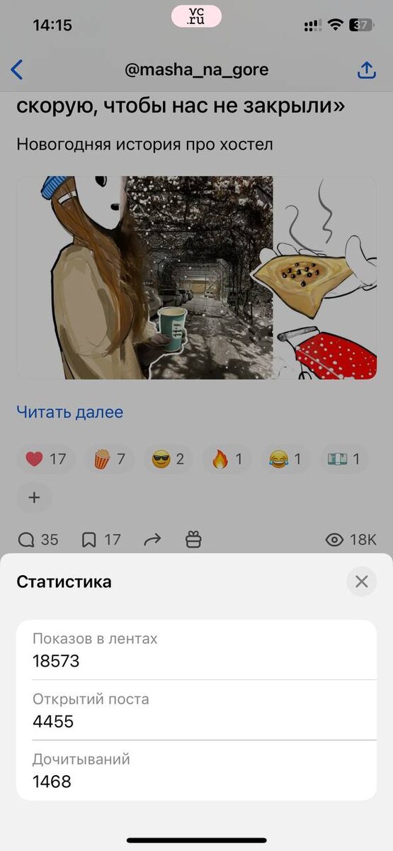 «31-го кто будет читать» Ну, смотрите, мне тоже представлялось, что 31-го «все» в глэмпингах без связи 🏕 В целом идея постинга на каникулах казалась (и кажется) хорошей, дескать, числа 5-го... Клиентам мы тоже советовали даты под конец каникул. Ну, ладно, свой новогодний хостел можно даже 4-го. ⛄️ Но чтоб прям 31-го? А человек-который-никогда-не-работал-в-найме (и, соответственно, с корпоративными НГ-контент-планами) говорит, давай. Почему нельзя запостить новогоднюю статью в новогодний день? Это ЛОНГ — и смотрите цифры ) Мы висели на первом месте популярного — и это не просто «ну провисели, пока никто другой не постил, ну и что». Смотрите все цифры: и открытия, и дочитывания. Комменты были и в 23:00, вероятно, из глэмпингов ) Я (как раз) болею, валялась на диване у подруги и отвечала про узбекские вайбы 🇺🇿 Примечание. Понятно, тут время + цель + уместность темы. У какого-нибудь продуктового кейса, типа доработки 1С, 31-го, возможно, были бы другие результаты ) Примечание 2