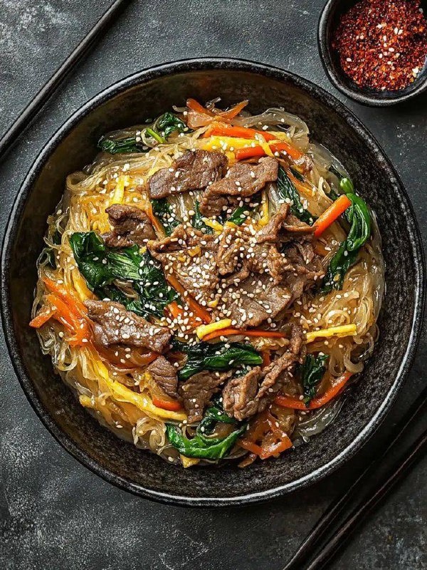 Рецепт Чапче, или «Стеклянные нити судьбы с мясным подмигиванием» Ингредиенты: · Лапша для чапче (данмён) — 400 г. Выглядит как пачка седых, хрупких проводов, но обещает превратиться в блестящие нити счастья. · Мясо (говядина/свинина) — 350 г. Лучше всего — вырезка. · Морковь — 0,5 шт. Одна одинокая морковка-интроверт, которая ярко раскроется в процессе. · Перец болгарский красный — 1 шт. Для цвета и настроения. · Лук репчатый — 0,5 шт. Его половинка заплачет на разделочной доске, но позже утешится в сладком соусе. · Шпинат свежий — 150 г. Пучок железной зелени для витаминной совести. · Грибы древесные (сухие) — 2 г. Горстка сморщенных ушек, которым предстоит великое преображение. · Чеснок — 2 зубчика. Душа компании. · Яйцо — 1 шт. + 1 желток. Для роскошного желтого блинчика-солнышка. · Соевый соус, масло кунжутное, сахарный сироп, кунжут обжаренный, соль, перец — Это квартет, без которого наша симфония вкуса не состоится. Приготовление: 1. Начнем с главного героя — мяса. Нарежь ег