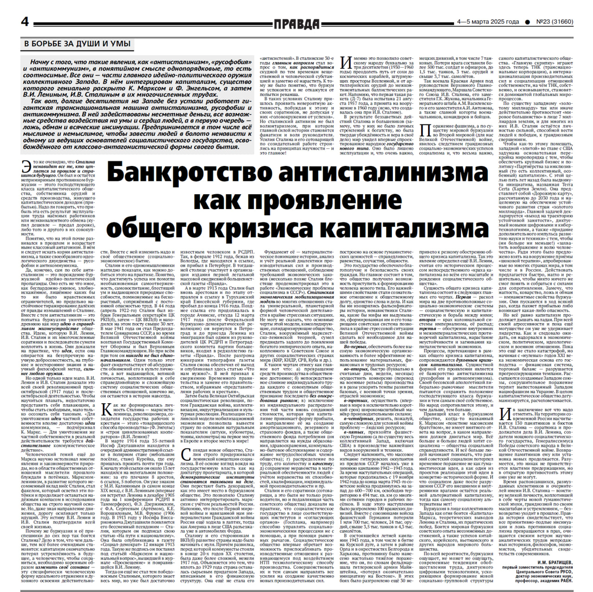 В эти праздничные дни, когда между выпусками газеты возникает вынужденная пауза, мы предлагаем вернуться к одному из мартовских текстов «Правды», который хорошо читается без новостной спешки. Март в «Правде» стал месяцем принципиального идеологического разговора. Не о частных событиях и не о тактических спорах, а о фундаментальных причинах происходящего, о кризисе капитализма и о тех формах, в которых он проявляется в политике, истории и массовом сознании. Историческая тема в марте была обращена не к прошлому как таковому, а к его смыслу. Речь шла о борьбе вокруг интерпретации советского опыта, о целенаправленных попытках дискредитации социализма и его лидеров, о том, почему антисталинизм, русофобия и антикоммунизм выступают сегодня как единый идеологический комплекс. Социально-экономический ракурс дополнял эту картину. Мартовские публикации показывали, что кризис капитализма носит не временный, а системный характер. Он затрагивает экономику, политику, культуру и само представление о
