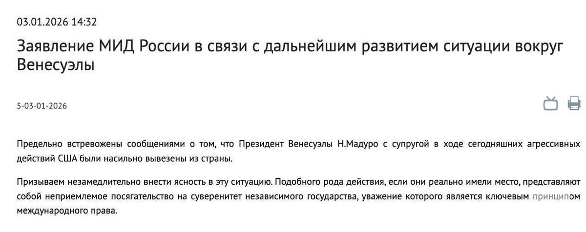 Россия призывает внести ясность в ситуацию с "вывозом" из Венесуэлы Мадуро и его супруги.