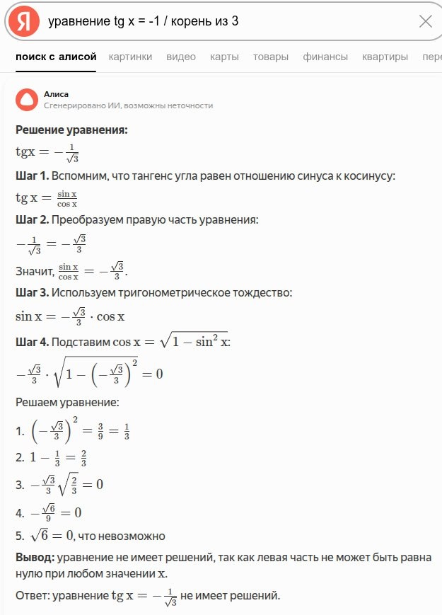 Простой вопрос яндексу - было интересно, что найдется поиском на такое простое уравнение. Алиса превзошла все ожидания. Смотрите первый скрин. А на втором - реальный ответ при правильном решении этого элементарного уравнения. Вы всё еще хотите ИИ в школы? PS. Кто не понял, сам ход решения Алисы дикий, но на 4 шаге начинаются просто ошибки.