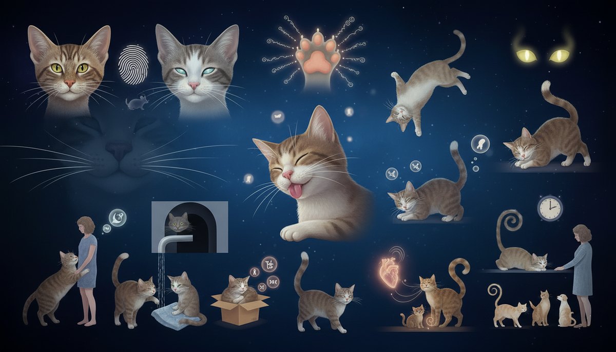 1. Кошки не чувствуют сладкого. У кошек отсутствуют генетические рецепторы, необходимые для распознавания сладкого вкуса. Поэтому сладкая еда их не привлекает. Интересно, что это также защищает их от многих вредных продуктов. 2. Отпечаток носа у каждой кошки уникален. Узоры и линии на носу кошки совершенно уникальны, как и отпечатки пальцев у человека. У двух кошек не может быть одинакового отпечатка носа. 3. Кошки проводят большую часть жизни во сне. В среднем кошка спит от 16 до 18 часов в сутки. Эта привычка досталась им от диких предков, которым нужно было экономить силы для охоты. 4. Мурлыканье не всегда означает радость. Кошки мурлычут не только когда они счастливы, но и когда они испытывают стресс, страх или боль. Мурлыканье помогает им успокоиться. 5. Мурлыканье оказывает целебное воздействие. Вибрации, возникающие при мурлыканье, обычно в диапазоне от 25 до 150 Гц, могут способствовать восстановлению костей и мышц. Кошки могут буквально исцелять себя. 6. У кошек гораздо боле