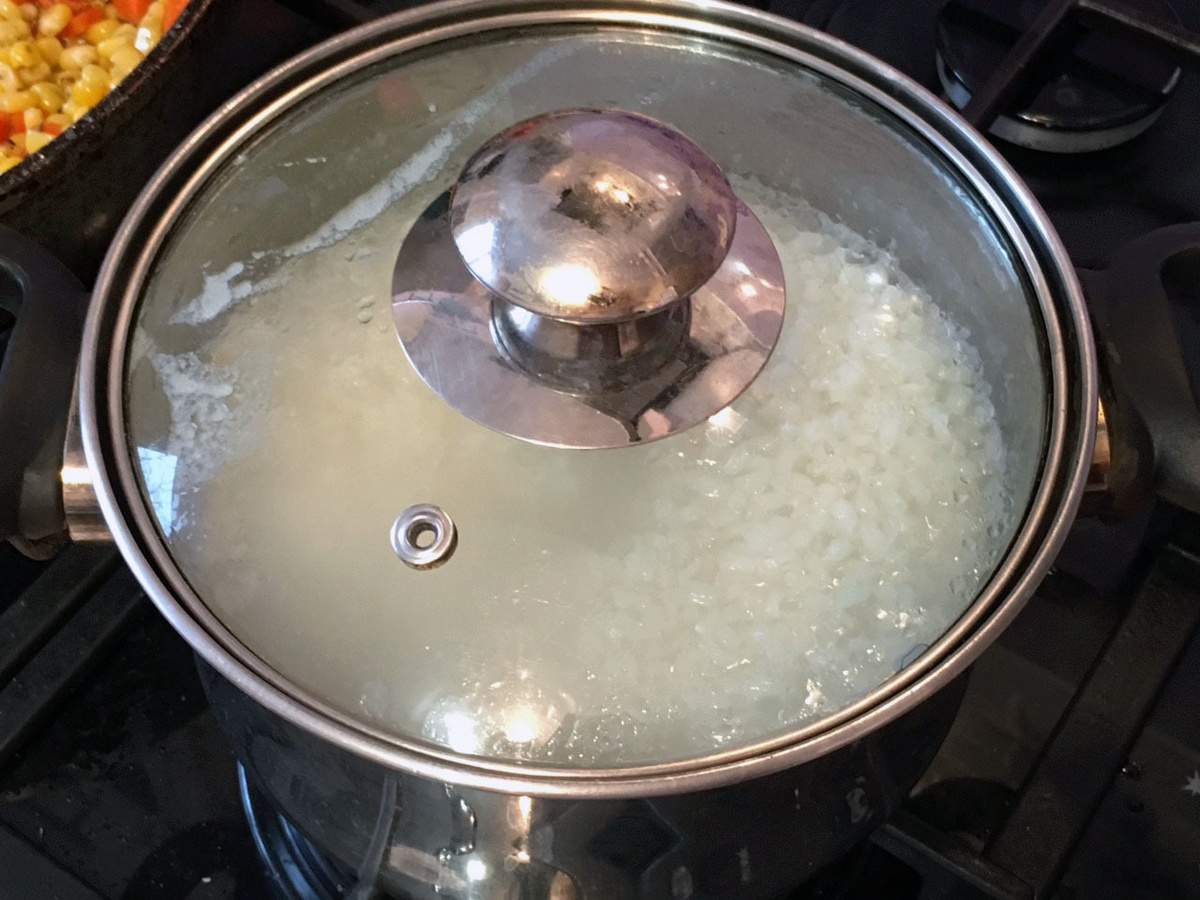 1. Первым делом я ставлю варить рис. Отмеряю полтора стакана риса и тщательно промываю его под холодной водой, пока вода не станет прозрачной. Это помогает удалить лишний крахмал, и рис получается более рассыпчатым. Затем я высыпаю рис в кастрюлю, заливаю его водой (обычно это в два раза больше, чем риса, то есть три стакана воды на полтора стакана риса), немного солю и ставлю на сильный огонь. Как только вода закипит, я убавляю огонь до минимума и варю рис примерно 7 минут. Мне нужно, чтобы он был доведен до полуготовности, такой немного упругий внутри.