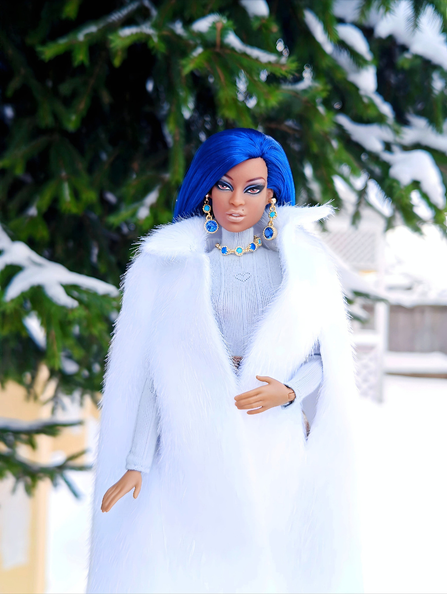 На Адель был белоснежный меховой кейп — воплощение зимней роскоши. Его создала талантливая мастерица Наталия Позолотина. Уже несколько кукол моей коллекции примерили этот великолепный предмет одежды, но сегодня он украсил мою экзотическую красавицу.