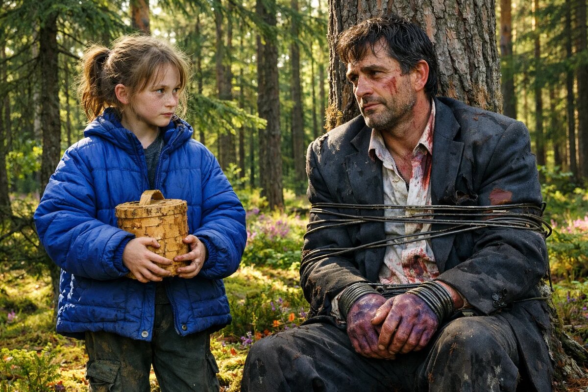 Стон услышала у ельника. Звук чужой, не лесной. Она замерла. Дед говорил всегда: "Человек в лесу опаснее медведя". Подкралась бесшумно и увидела мужика, привязанного к сосне стальной проволокой. Руки синие, лицо — месиво. Пиджак дорогой, но порванный. Ботинки городские, для леса не годятся.