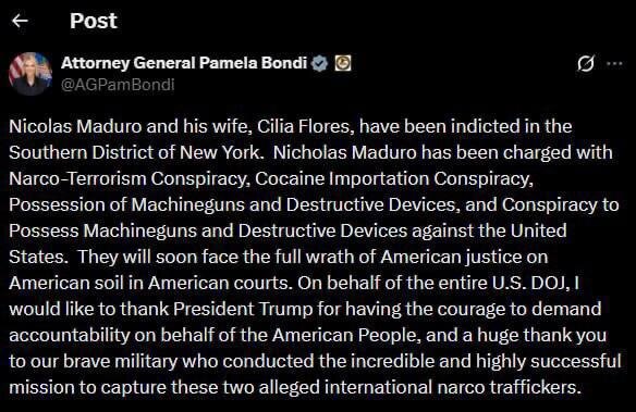 США предъявили Николасу Мадуро и его супруге обвинения в наркотерроризме Об этом сообщила генеральный прокурор страны Памела Бонди: «Николас Мадуро и его жена Силия Флорес были обвинены в Южном округе Нью-Йорка. Николас Мадуро обвиняется в заговоре с целью наркотерроризма, заговоре с целью импорта кокаина, владении автоматическим оружием и разрушительными устройствами, а также заговоре с целью владения автоматическим оружием и разрушительными устройствами против Соединенных Штатов. Вскоре они столкнутся с полным гневом американского правосудия на американской земле в американских судах». ТВК