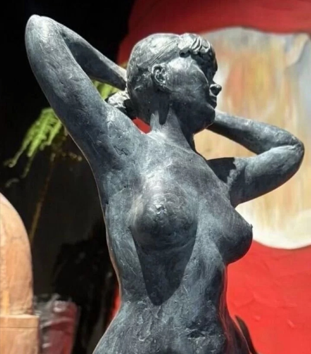 На все эти вопросы гениально ответил мастер. Глядя на его работу, видишь практически оптимальное сочетание достаточно противоречивых эмоций: горделивая поза с широко расставленными ногами сочетается с мягкой улыбкой на лице и добрыми глазами, в то же время, прямая спина модели, пальцы рук, сплетёные сзади головы, под пучком красивых волос, всё это свидетельствует о смелости и решимости натуры, готовой радикально обозначить красоту своих прелестей.