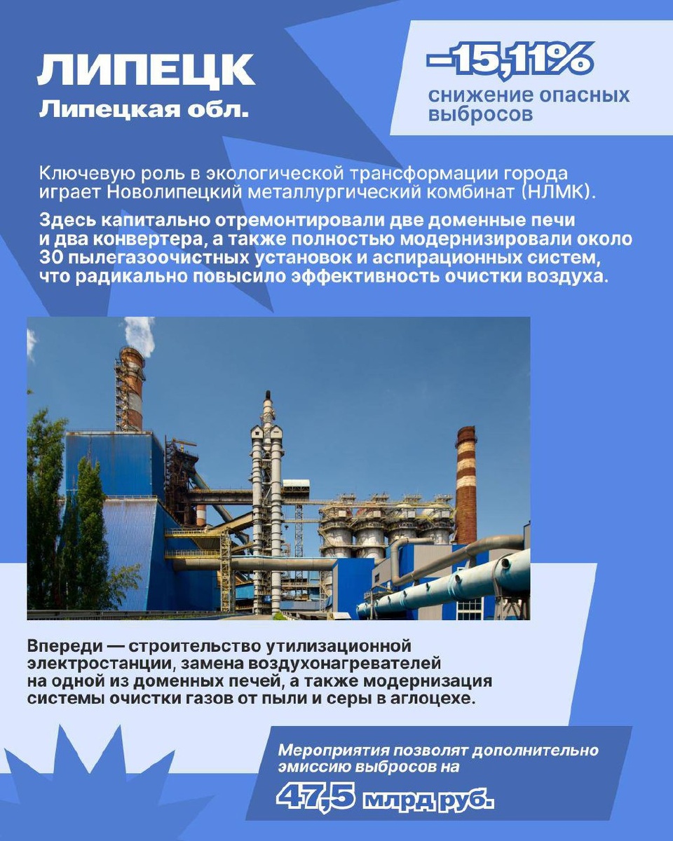 ». 2025 год подарил экологичное тепло в домах и подтвердил эффективность множества экологических мероприятий. В первой части нашего спецпроекта мы посетим города Липецк, Череповец и Медногорск Металлурги модернизируют промышленные объекты и устанавливают системы автоматического контроля выбросов с онлайн передачей данных в Росприроднадзор. 🌱 ⭕НМЛК модернизировали около 30 пылегазоочистных установок и аспирационных систем, а также полностью исключили запах сероводорода в Липецке. ⭕СЕВЕРСТАЛЬ подтвердила выполнение всех 28 мероприятий федпроекта «Чистый воздух» на уровне Росприроднадзора. ⭕ММСК произвел техническое перевооружение химико-металлургического комплекса в Медногорске, что позволило уменьшить выбросы более чем в 17 раз и увеличить степень утилизации газов до 98%. ↗️ Листайте карточки, чтобы узнать как города меняются к лучшему!