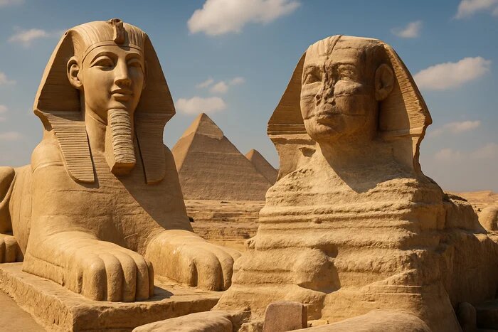 Но самым поразительным элементом был его цвет. Следы пигмента, найденные археологами, позволяют утверждать, что Сфинкс был ярко раскрашен: его тело сияло желтой охрой, символизирующей солнце и нетленную плоть божества, а головной убор немес был расписан синими и желтыми полосами. Лицо, обращенное строго на восток, к точке восхода солнца в дни равноденствия, имело естественные черты, с подведенными темной краской глазами и, возможно, улыбкой, застывшей на устах.