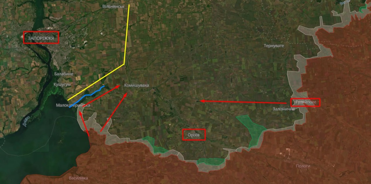 В районе Запорожья ГВ «Днепр» ещё перед Новым годом вышла к реке Конке (синяя линия), за которой начинаются фактически окраины самого областного центра, и повернула вдоль неё на восток. Параллельно удалось обойти Степногорск и дальнейший вектор наступления понятен, здесь ВС РФ нужно выйти к посёлку Камышеваха, через который проходит трасса Запорожье-Орехов. Параллельно с востока должна подойти ГВ «Восток» после того, как форсирует реку Гайчур. О сроках здесь говорить сложно, после полноценного форсирования реки и линии обороны нужно пройти ещё как минимум 25-30 км, что при среднем темпе движения по 5 км в месяц может занять до полугода. Тем не менее общий замысел понятен. Далее, после взятия Орехова, обе группировки могут выйти к линии обороны вокруг Запорожья, первый обвод ИФС расположен примерно по жёлтой линии, за ним есть ещё, да и построить их успеют. Однако само Запорожье — слишком большой и слишком неудобный для штурма город с одной стороны, с другой, конечно, можно уничтожить
