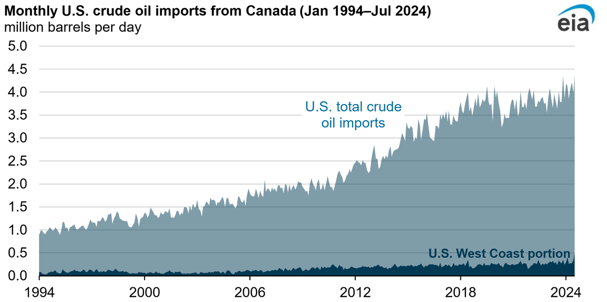 "Тяжёлая нефть. Американцы точно идут в Венесуэлу за тяжёлой нефтью, без которой не могут работать их нефтеперерабатывающие заводы". Крупнейшим внешним поставщиком сырой нефти в США является Канада. Настолько крупнейшим, что она обеспечивает примерно половину всего импорта. По удивительному стечению обстоятельств Канада является обладателем одних из самых больших запасов тяжёлой нефти. Соединённые Штаты импортируют из Канады 3,5-4 млн баррелей в сутки. Вся добыча в Венесуэле — около 1 млн баррелей в сутки. Перед тем, как США ввели против Венесуэлы санкции в 2019 году, оттуда импортировалось примерно 0,6 млн баррелей в сутки. В октябре 2025 года этот показатель составлял 0,135 млн баррелей в сутки. Ой, то есть что же это? Венесуэла поставляет нефть в США?? Да, с 2023 года поставки возобновились. Никакой сверхнеобходимости в тяжёлой венесуэльской нефти у НПЗ в Соединённых Штатах нет. Во всяком случае нет ничего такого, чего нельзя было бы решить за счёт Канады, смешения с мазутом или ин