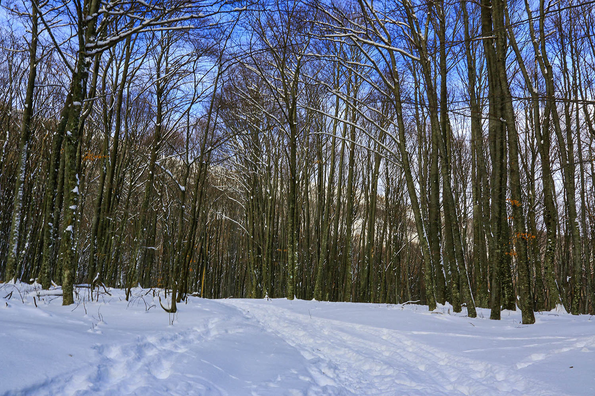 Все началось с того, что из Москвы в Крым приехал московский фотограф (и не только фотограф) Леня Плаксенко (уже встречавшийся в моих публикациях). И как всегда, его приезд "заканчивается" (точнее начинается) очередной прогулкой по горам. В этот раз местом для "мазохизма" т.е. для прогулки по горам был выбран Чатыр-Даг. Было решено прогуляться ч Ангарского перевала через Тиссовое ущелье на Ангар-Бурун. А раз было решено, то и было осуществлено. И утром на Ангарском перевале встретилась команда в которой Симферополь представляли я, мой коллега по универу Виктор Бутрим с дочерьми Машей и Аней, Кирилл Самсонов, Севастополь Сергей с Лилей, Москву Леня в одиночестве. И конечно же Найк. Погода была на загляденье легкий мороз, солнце и белоснежный снег. В принципе маршрут в точности совпадал с недавно описанным сентябрьским - https://dzen.ru/a/aL18_zsH-A-uOHkT . Т.е 4 км на север вдоль плато. 300 метров по вертикали вверх до Нижнего плато. Метров 200 на север по Тиссовому ущелью. Далее